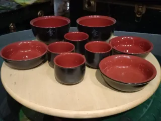 Set di ciotole in porcellana con un elegante design bicolore. - Ciotole con finitura interna rossa e esterna nera. - Motivo decorativo in stile giapponese su alcune ciotole.