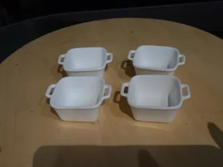 Set di 4 mini ciotoline in porcellana bianca, perfette per servire. - Design a forma di teglia. - Manici laterali. Guardare bene la foto per comprendere la dimensione