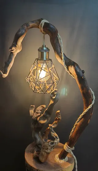 Lampada dal design unico con base in legno grezzo e paralume inLampada artigianale in legno naturale e corda, realizzata interamente con materiali naturali. La base e la struttura sono in legno massello non trattato, lavorato a mano per valorizzarne le forme originali e uniche. Il paralume in tessuto è impreziosito da dettagli in corda naturale. Un pezzo unico dal design ideale tutti gli ambienti. Caratteristiche: Materiali 100% naturali (legno e corda) Completa di impianto elettrico funzionante Ottima come complemento d’arredo o idea regalo originale. Misure: Altezza cm 49 Larghezza max cm 20 In vendita al prezzo di €80