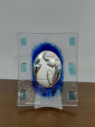 Delicato quadretto in vetro, ideale come ricordo per la Prima Comunione. Raffigura un ragazzo in preghiera con un calice. - Decorazione con dettagli blu. - Elemento centrale in metallo argentato.