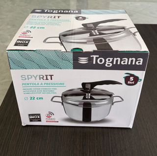 Pentola a pressione Tognana SPYRIT, nuova e mai usata. - Capacità: 5 litri - Diametro: 22 cm - Materiale: Acciaio Inox con fondo triplo strato - Manici ergonomici