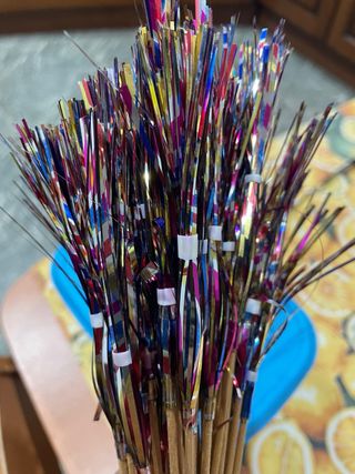 Set formato da 89 pezzi di decorazioni per cocktail o gelati, perfette per aggiungere un tocco di colore alle tue bevande o dessert. - Motivo a fiorellino con sfumature arancioni e gialle. - Base in legno per un facile inserimento.