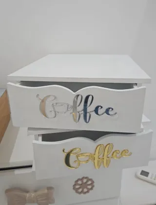 Elegante cassettiera con scritta Coffee in acrilico specchiato. Perfetta per organizzare le tue capsule o bustine di caffè. - Design moderno con finitura in legno bianco. - Scritta Coffee in acrilico dorato. - Cassetti con maniglia a forma di fiocco. - Decorazione floreale sul cassetto inferiore.