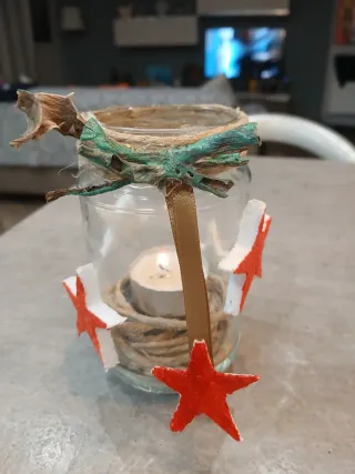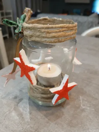 Un grazioso portacandele decorato, perfetto per creare un'atmosfera festiva. - Decorazioni con stelle rosse e dettagli in corda. - Elementi naturali e colorati. - Ideale per candele.