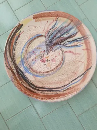Bellissimo piatto decorativo in terracotta smaltata, perfetto per aggiungere un tocco artistico alla tua casa. Realizzato negli anni 90, dal Maestro Artigiano Messina di Santo Stefano di Camastra (ME) - Diametro: 56 cm. - Design unico e colorato.
