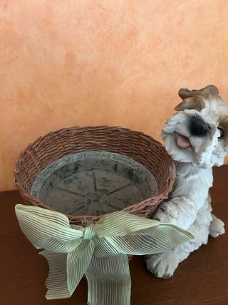 Grazioso vaso decorativo in vimini per fiori o piante con una simpatica statuetta di cane. Perfetto per aggiungere un tocco di originalità alla tua casa...Statuetta del cane molto carina, ricca di dettagli e alta circa 30 cm in plastica molto dura...Vaso/cesto in vimini con diametro di circa 24 cm. In perfette condizioni!