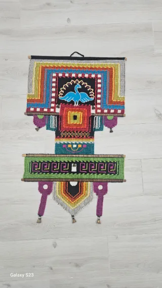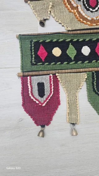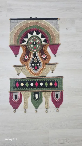 Bellissimo arazzo vintage in stile art deco, realizzato a mano con cura. - Design unico e colorato. - Elementi decorativi in tessuto. - Struttura in legno.