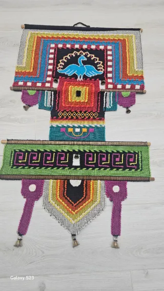 Bellissimo arazzo vintage realizzato a mano con uno stile Art Deco. - Design unico con un pavone al centro. - Motivi geometrici colorati. - Elementi decorativi pendenti.