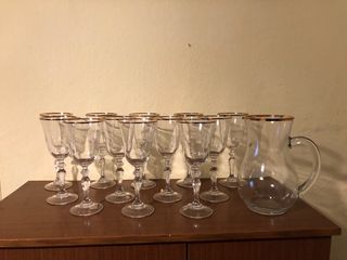Set 10 di calici da vino e una bottiglia con dettagli dorati. la - Calici con bordo dorato. - Bottiglia in vetro trasparente con tappo.