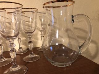 Set di 12 calici con bordo dorato e una brocca cordinata. Perfetti per ogni occasione. La brocca è alta 21 cm i calici 19 - Bordo decorato in oro. - Vetro trasparente di alta qualità. - Design elegante e raffinato.