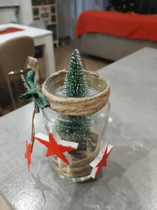 Deliziosa decorazione natalizia creata con materiali misti. Perfetta per aggiungere un tocco festivo alla tua casa. - Alberello innevato all'interno di un barattolo. - Decorato con spago e fiocco. - Dettagli a forma di stella rossa e bianca.