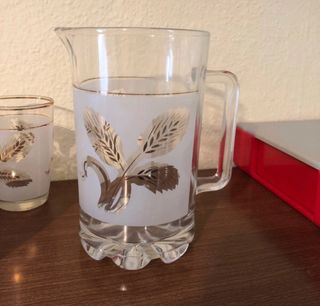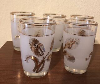 Set di 5 bicchieri con un elegante bordo dorato e decorazioni a tema vegetale. - Decorazioni dorate con spighe di grano. - Bordo superiore con finitura dorata.