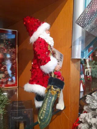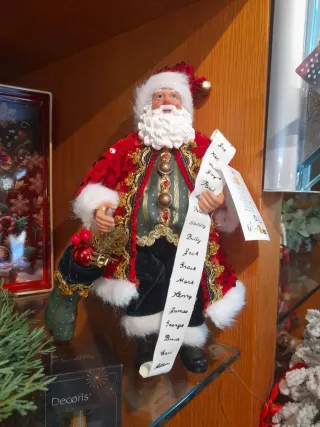 Babbo Natale decorativo con la sua lista dei desideri. - Vestito rosso con dettagli dorati. - Barba bianca folta. - Cappello natalizio con pon pon. - Calza verde appesa.
