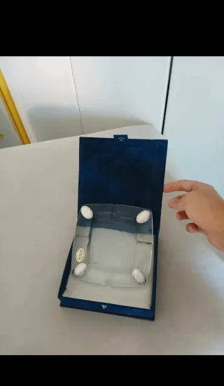 Elegante posacenere o svuotatasche con dettagli in argento. - Base in vetro trasparente. - Bordi e piedini in argento finemente lavorati. - Ideale come centrotavola o portaoggetti. - con scatola/confezione in velluto