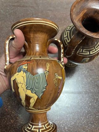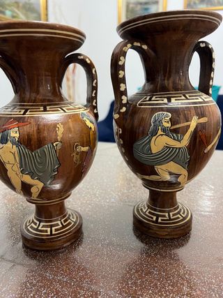 Set di due anfore in legno con decorazioni dipinte a mano. - Design ispirato all'arte greca. - Dettagli con motivi geometrici. - Manici curati e finitura lucida.