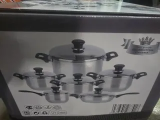 Set di pentole di alta qualità, ideale per la cucina di tutti i giorni. Include una pentola con coperchio, una pentola con manico e coperchio, uno steamer e una padella con coperchio e base-grill interna. - Pentola (teglia) con coperchio in vetro. - Pentola con manico e coperchio. - Steamer in acciaio. - Padella con coperchio e base-grill interna. - Include accessori: 1pc meat fork, 1pc soup ladle, 1pc egg shovel, 1pc soup spoon, 1pcs whisk, 1pcs pasta ladle.