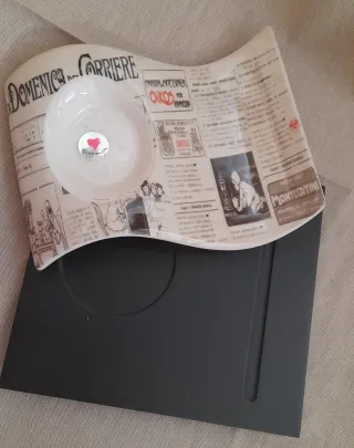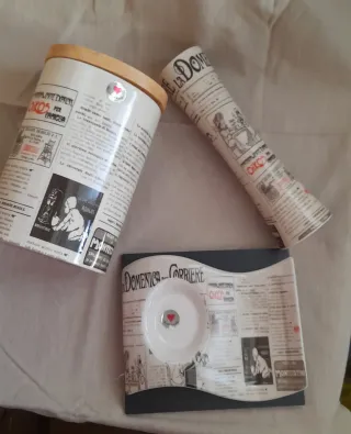 Set di tre pezzi in ceramica con design ispirato alle pagine di giornale. - CUORE Matto - Colori beige e bianco.
