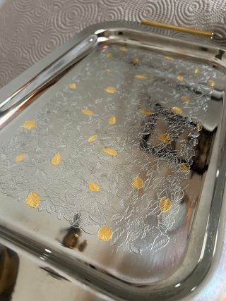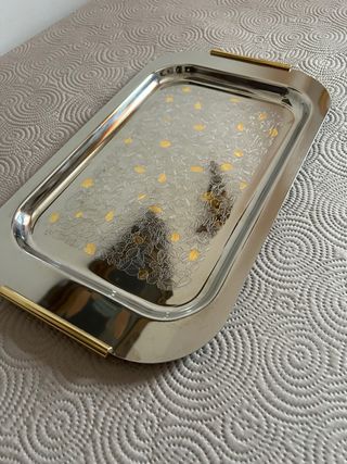 Elegante vassoio vintage in acciaio con splendide decorazioni in oro 18K. - Design rettangolare con bordi arrotondati. - Manici dorati integrati. - Motivo floreale inciso con dettagli dorati, splendido. Ottimo stato, quasi mai usato. Decorativo e versatile. Misure: 46cm x 27cm circa (vedere foto).