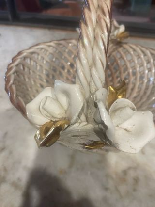 Elegante centrotavola in ceramica, realizzato con una lavorazione a cestino che aggiunge un tocco di raffinatezza. - Dettagli in oro. - Decorazioni floreali applicate.