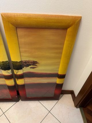 L'immagine mostra un trittico (una serie di tre pannelli) di un dipinto intitolato "Kenya" dell'artista Lazlo Emmerich. Il dipinto raffigura un paesaggio stilizzato con alberi che ricordano le acacie, tipiche della savana africana, su uno sfondo che sfuma dai toni del giallo e arancione a quelli del rosso e del marrone. Questa riproduzione d'arte dell'opera di un grande maestro, é stata completata con una cornice in legno completamente dipinta a mano, in fedele armonia con l'immagine, rendendola così un'opera unica.