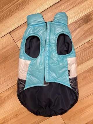 Cappottino imbottito per cani, perfetto per le giornate più fredde. Presenta un design a blocchi di colore con finiture lucide. - Taglia: M - Lunghezza dorso: 34 cm - Circonferenza torace: 23 cm - Patch rotonda con logo sul fondo