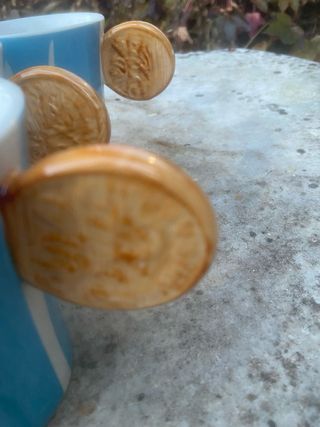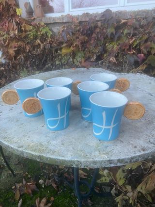 Set di sei tazzine dal design originale, perfette per un caffè speciale. - Manici unici a forma di biscotto. - Decorazione con lettera 'H' stilizzata. - Colore vivace per un tocco di allegria.