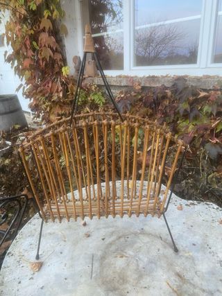 Elegante porta riviste dal design vintage, perfetto per aggiungere un tocco di stile alla tua casa. - Struttura in bambù intrecciato. - Gambe e manico in metallo nero.