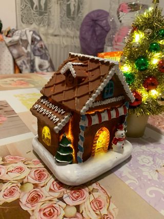 Deliziosa decorazione natalizia con dettagli dorati e una candela rossa. - Base decorata con personaggi e alberelli. - Ideale per creare un'atmosfera festiva.