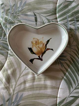 Deliziosa ciotola a forma di cuore Tognana, perfetta per piccoli oggetti o pietanze o come elemento decorativo. - Design a forma di cuore - Decorazione floreale - Bordo verde Ottime condizioni, misura circa 19cm x 14 cm (vedere foto).