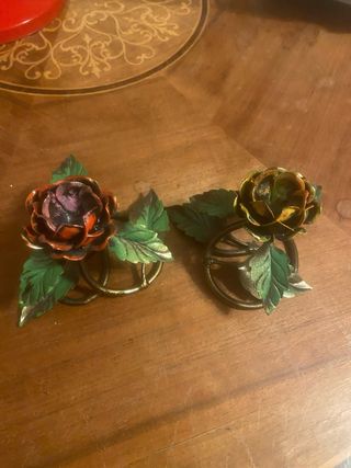 Deliziosi porta candele in ferro battuto, decorati con rose e foglie. - Design floreale unico. - Finitura color oro e verde. - Ideali per aggiungere un tocco di eleganza.