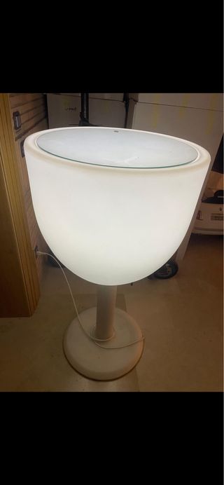 Lampada da terra con un design moderno e accattivante. La sua forma unica la rende un elemento d'arredo distintivo. - Struttura in plastica resistente. - Piano superiore in vetro trasparente.