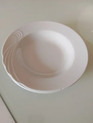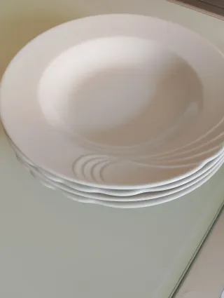 Elegante set di quattro piatti fondi,8 frutta,8 piani,in porcellana bianca, perfetti per ogni occasione. Il design presenta un motivo decorativo a spirale sul bordo. - Motivo a spirale sul bordo