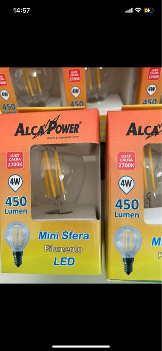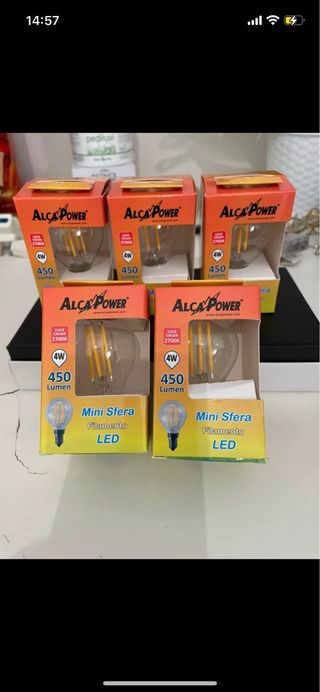 Set di 5 lampadine a filamento LED ALCA POWER. - Potenza: 4W - Temperatura colore: 2700K (luce calda) - Flusso luminoso: 450 Lumen - Modello: Mini Sfera