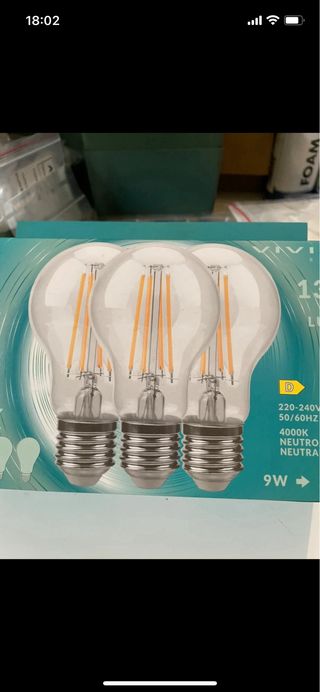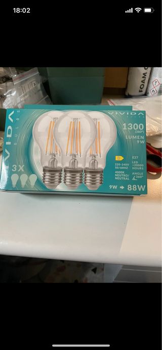 Set di 3 lampadine a filamento LED marca VIDA. - Potenza: 9W (equivalente a 88W). - Flusso luminoso: 1300 Lumen. - Temperatura colore: 4000K (luce neutra). - Attacco: E27. - Durata: 20000 ore. - Angolo di illuminazione: 360°.