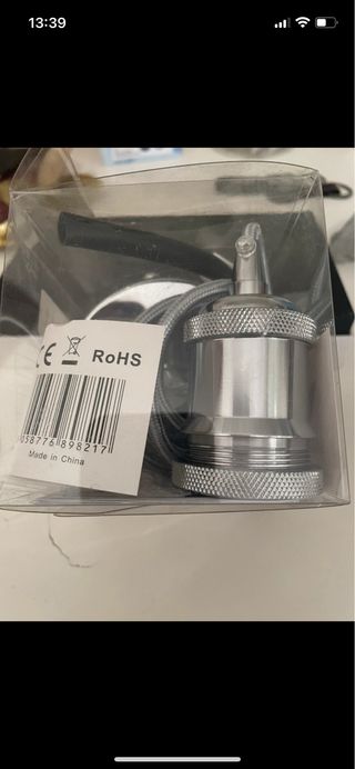 Portalámparas con cable textil de color plateado. El portalámparas es de metal con un acabado brillante. - Material: Metal - Color: Plateado - Cable textil - Certificación RoHS