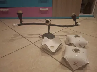 Lampadario a due bracci con dettagli in ceramica. - Struttura in metallo. - Elementi decorativi in ceramica bianca con disegni floreali. - Due portalampada.