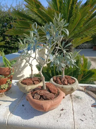 Set di tre piante di ulivo in stile bonsai, perfette per aggiungere un tocco di verde. - Vasi giarre in terracotta - Decorazione con corteccia. - Adatte per esterni.