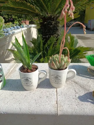 Set composto da due piante grasse, ognuna coltivata in una tazza decorata con la scritta Sweet Home Coffee. - Piante grasse in vaso. - Tazze decorative Coffee incluse.