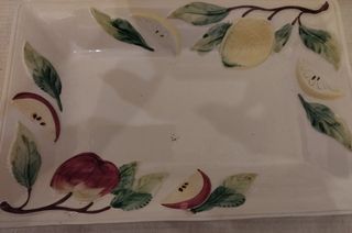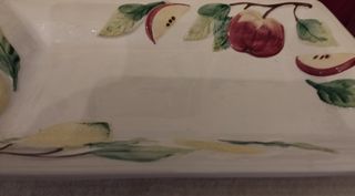 Elegante vassoio rettangolare in ceramica, decorato con mele e foglie. - Design con mele rosse e verdi. - Foglie verdi dipinte. - Bordo decorato. 21x31 cm