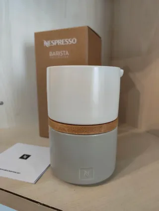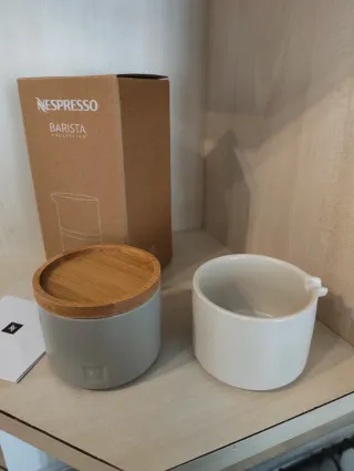 Elegante set Nespresso per servire latte e zucchero. - Componenti impilabili per un facile stoccaggio. - Design moderno con finiture in bambù e ceramica.