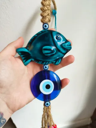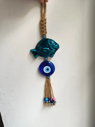 Deliziosa decorazione da appendere con un pesce stilizzato e un occhio di vetro blu, rifinita con corda di juta. - Elemento a forma di pesce in tonalità blu/verde acqua. - Disco in vetro blu con il classico occhio turco. - Corda di juta intrecciata per appenderla. - Dettagli con piccole perline colorate alla base.