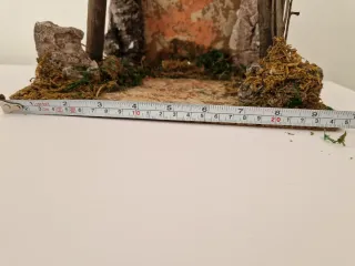 Capanna artigianale per presepe, realizzata con materiali naturali. - Struttura in legno e pietra. - Tetto in paglia e rami. - Decorazioni in muschio.