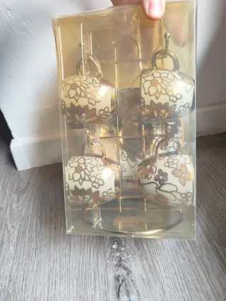 Elegante set di quattro tazzine da caffè con un design floreale raffinato. - Tazzine in ceramica con decorazioni oro e bianche. - Supporto in metallo dorato per esporle. - Ideale per un tocco di classe sulla tavola.