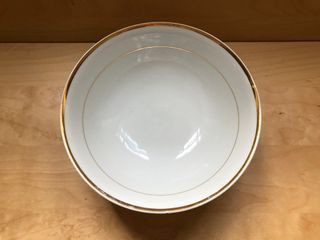 Ciotola come da foto. Doratura rovinata, visibile sbeccatura in ultima foto. Diametro: 23cm