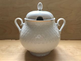 Zuppiera come da foto, in ottime condizioni. Tutta la doratura è presente, sia sopra che sotto. Lavorazione superficiale della ceramica a squame. Diametro zuppiera alla bocca: 14cm