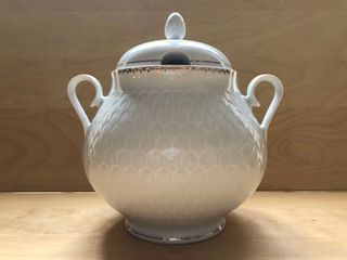 Zuppiera come da foto, ben conservata. La doratura è integra ma presenta punti di ossidazione qua e là, vedi foto. Diametro zuppiera: 30cm manici inclusi Diametro zuppiera: 21cm manici esclusi Altezza: 20cm compreso coperchio Diametro foro: 16cm