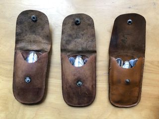 Set di posate come da foto in acciaio INOX, condizioni buone, non perfette. Si aprono e si chiudono regolarmente. Lunghezza da aperte: 16cm Lunghezza da chiuse: 9cm Dimensione custodia chiusa: 12x8,5cm Custodie in cuoio. La prima tende leggermente ad aprirsi sul fondo perché un pezzo si è scucito. (vedi foto). Vendibili anche in blocco al prezzo di 55€.
