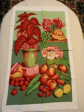 Set di 5 strofinacci in cotone con fantasie assortite. - Fantasia frutta e agrumi. Lungo 75 cm largo 45 cm. - Fantasia floreale con bordi gialli e blu. Lunghi 60 cm, larghi 43,5 cm. - Fantasia con strisce rosse e disegno botanico. - Fantasia a quadretti verdi. - Fantasia a quadretti blu con inserto a pois rossi. Lunghi 63 cm, larghi 46 cm.