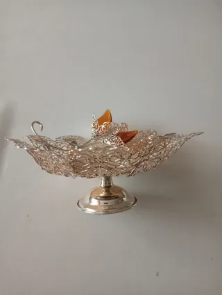 Elegante cestino soprammobile con dettagli traforati e decorazioni a forma di foglia. Alto 8 cm, largo 17 cm. - Struttura in metallo argentato. - Elementi decorativi in materiale simile all'ambra o resina. - Design traforato e lavorato.