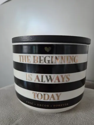 Elegante candela decorativa con un design a righe. - Motivo a righe bianche e nere. - Coperchio in legno scuro. - Scritta THE BEGINNING IS ALWAYS TODAY in oro. - Piccola decorazione a forma di cuore dorato.